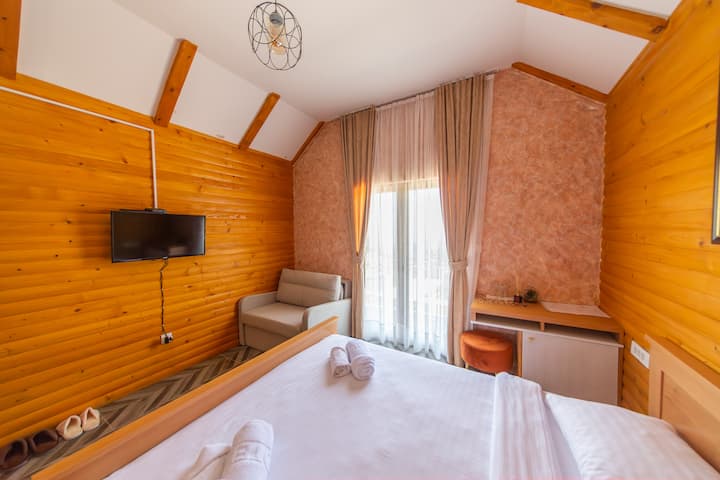 Mirna brvnara s pogledom na planine