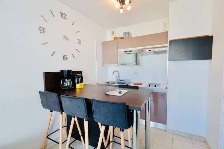 Idealno smješten u Juan-les-Pinsu, u srcu Exflora Parka, u rezidenciji Antibes Les Pins! Savršeno za najviše 4 osobe. Topao prostor koji spaja modernu udobnost i mediteranski šarm.