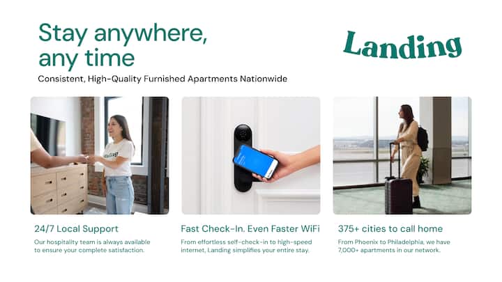 Landing je odabrana kolekcija namještenih stanova diljem zemlje u kojima se svaki smještaj osjeća kao kod kuće. Svaki Landing ima elegantan namještaj, potpuno opremljenu kuhinju, praonicu rublja, prostor za rad, brzi Wi-Fi i vrhunske sadržaje. Savršeno za rezervacije bez obzira na trajanje rezervacije, a služba za podršku vam je na raspolaganju 0 - 24.