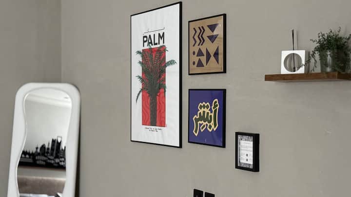 Na zidu dnevnog boravka pronaći ćete umjetnička djela Najdi Sadu, osnovnu saudijsku tradicionalnu umjetnost stanovnika Riyadh.