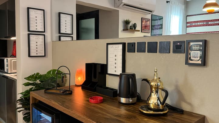Doživite ugodan, elegantan stan u mirnoj četvrti, smještenoj u blizini najpoznatijih znamenitosti u Rijadu. Opustite se u kupaonici koja izgleda kao u wellness centru i uživajte u svim sadržajima, uključujući veliki pametni televizor i udoban bračni krevet (183x213).