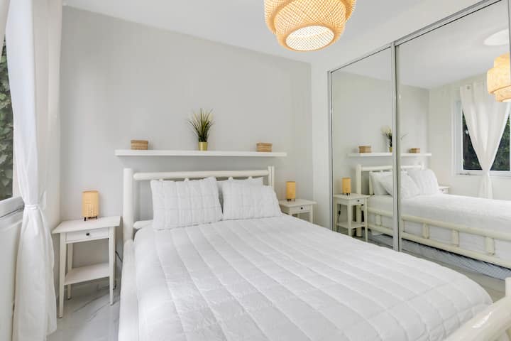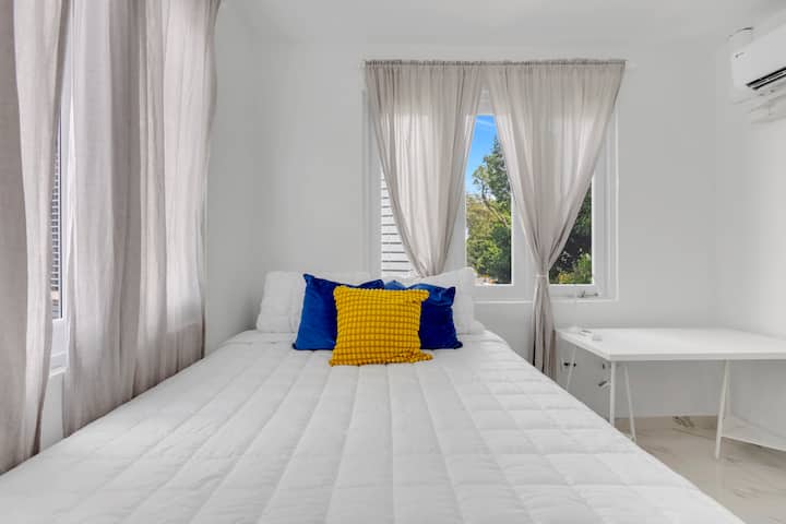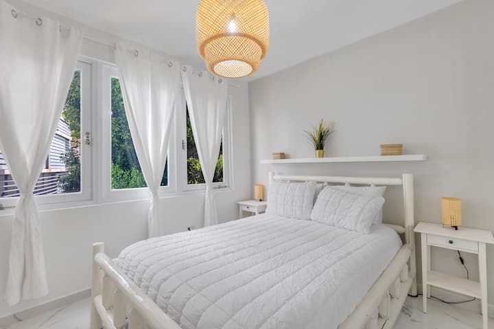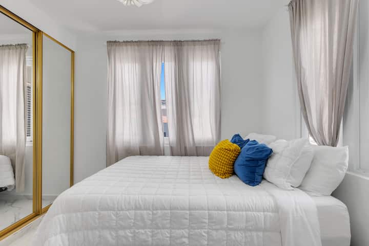 Naš stan može primiti šest osoba, a u svakoj spavaćoj sobi nalaze se bračni kreveti (150 × 200), svježa posteljina i dovoljno prostora za odlaganje stvari. Unutrašnjost ispunjena svjetlošću i moderni podovi stvaraju mirnu, prozračnu atmosferu, dok se u nedavno preuređenim kupaonicama spajaju završni detalji tipični za boutique hotele s estetskim rješenjima karakterističnim za San Juan – čiste linije, topli tonovi i suptilni utjecaji obalnog područja.