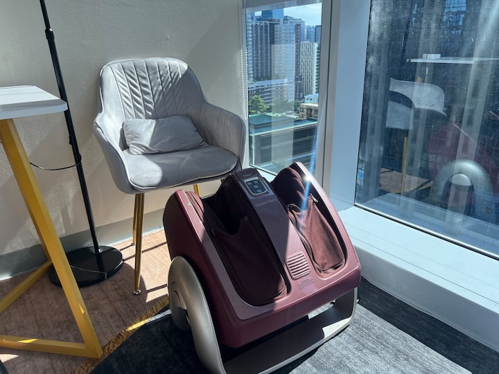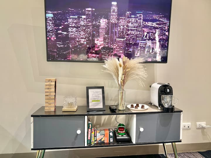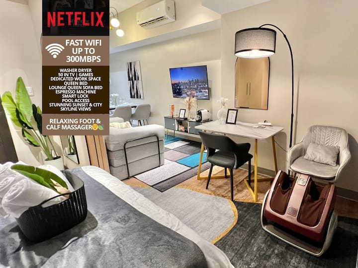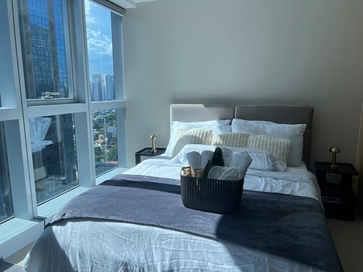 ✨ Savršen za 4 odrasle osobe + djecu, ovaj ugodni apartman s 1 spavaćom sobom u Uptown Parksuites Tower 1 ima QUEEN krevet, QUEEN kauč na razvlačenje s mekim poplunima, potpuno opremljenu kuhinju, perilicu/sušilicu rublja, WiFi do 300 Mbps i prekrasan pogled na zalazak sunca i gradsku panoramu BGC-a, Grand Hyatta i Manile 🌇 Nakon dugog dana, prepustite se opuštajućoj ležaljci i kauču s nevjerojatnim pogledom na grad 🍃Kratka šetnja do Uptowna, Mitsukoshija i Landersa 🤍
