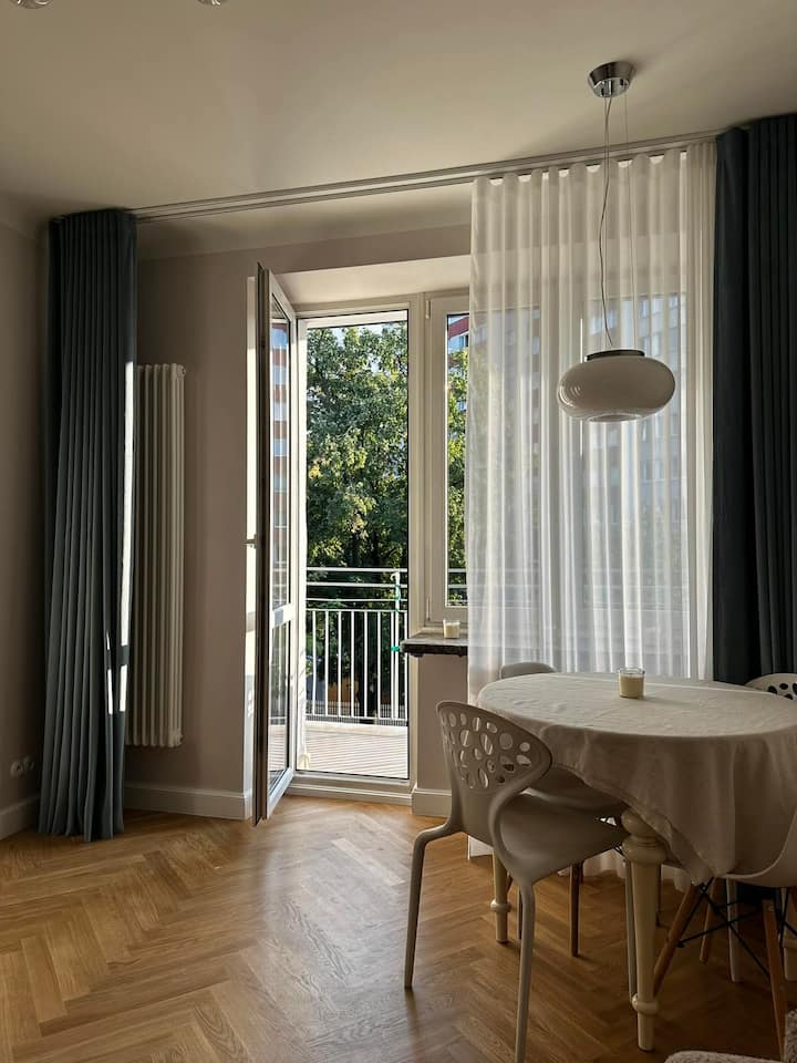Stan se nalazi na drugom katu u prekrasnom svijetlom stanu s dva ulaza i velikim balkonom. Stan je dobro povezan, stanica podzemne željeznice Dworzec Gdański udaljena je samo 3 minute hoda, odakle možemo doći do stanice podzemne željeznice u središtu za 6 minuta, 5 minuta do tramvaja i autobusne stanice odakle možemo doći do centra ili starog grada za 10 minuta, kao i 12 minuta hoda do novog grada. Apartman se nalazi u samom srcu četvrti Żoliborz, 2 minute hoda od Muzeja poljske povijesti. Stan je nedavno renoviran. U prestižnoj i zelenoj četvrti Żoliborz. Samo 2 minute hoda udaljen je novoosnovani Muzej poljske povijesti. Za manje od 7 minuta tramvajem možemo doći do Muzeja povijesti poljskih Židova Polin. Stan je također dobro povezan, a nalazi se u mirnoj oazi Varšave. Kafići, vinski barovi, restorani i slastičarnice nalaze se posvuda. U blizini se nalazi prekrasan park Citadela u Varšavi, prepun skulptura i voćaka. Najljepši parkovi (min. Park Żeromskiego) udaljen je samo 10 minuta hoda kroz ulice s povijesnim obiteljskim kućama. Nedaleko od stana (oko 10 – 15 minuta hoda) nalazi se prva modernistička vila Brukarskie u Poljskoj. U četvrti Żoliborz nalazi se mnoštvo zanimljivih građevina, muzeja, društvenih sadržaja i sadržaja za zabavu. Stan nakon opće renovacije, potpuno opremljen. U stanu se nalaze sredstva za čišćenje, kao i najpotrebnije toaletne potrepštine i ručnici.