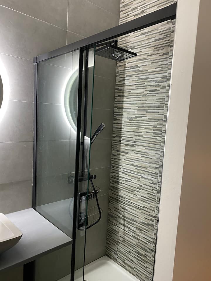 Moderna kupaonica ima prostrani tuš i umivaonik.