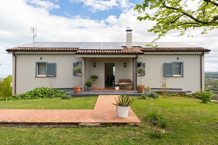 URONJENA U TIHINU prirode Abruzza, kuća se nalazi na slikovitom brdu, samo 5 km od PLAŽA JADRANSKOG MORE. Okružena velikim uređenim vrtom s očaravajućim pogledom na Jadransko more i planine LAGA.