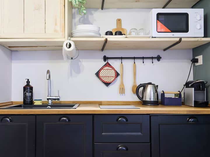 Potpuno opremljena kuhinja uključuje moderne aparate i sve osnovne kuhinjske potrepštine, idealne za pripremu brzog doručka ili opuštenog obroka.