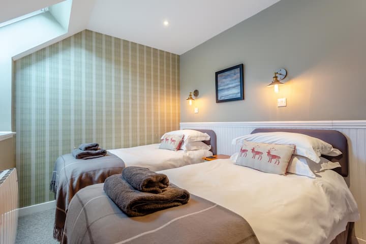 Ova moderna, elegantna kućica uređena je prema visokim standardima, nudeći suvremeni stil uz ugodnu atmosferu koja će vam pružiti osjećaj kao da ste kod kuće. Ulazite kroz zajednički ulazni trijem, idealan za odlaganje kaputa, čizama i vanjske opreme. Odatle zakoračite u dnevni boravak otvorenog plana – savršen za lagana jutra i opuštajuće večeri. Kupite lokalne namirnice i pripremite obrok u dobro opremljenoj kuhinji, a kad sve bude spremno, objedujte vani ili za stolom u zatvorenom prostoru. Nakon večere uključite radio ili pogledajte neki film na televizoru. Udobne sofe smještene su nasuprot peći na drva, što osigurava ugodnu atmosferu u ovom divnom prostoru. Na kraju hodnika na katu nalaze se dvije predivno uređene spavaće sobe. Dvokrevetna soba i dvokrevetna soba s odvojenim krevetima, obje s lijepim uređenjem. Obiteljska kupaonica pruža mirno mjesto za opuštanje ili osvježenje prije početka dana.