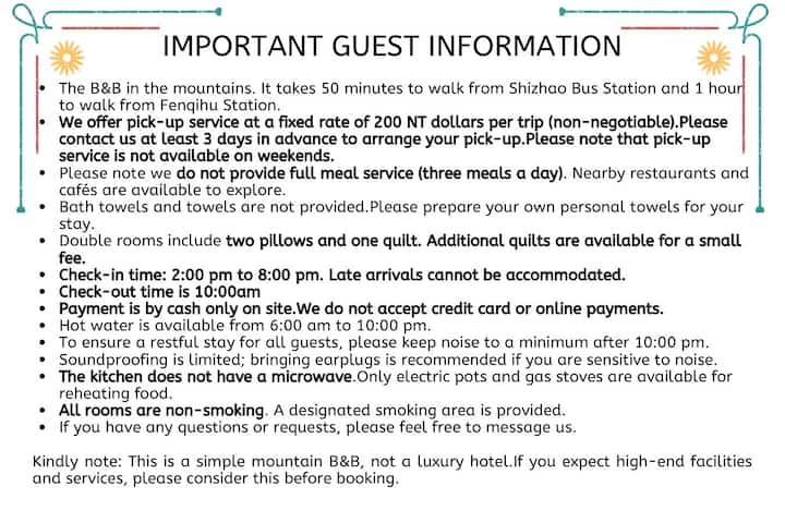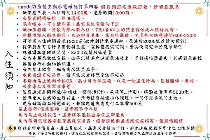 12. 本民宿為非常平價民宿,非五星飯店 ,高需求者請勿下訂 ,避免造成服務不周使之心情不悅。
