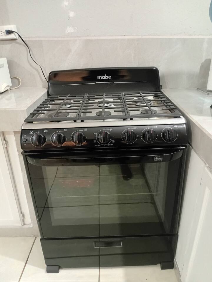 štednjak s rešetkom i pećnicom, mikrovalnom pećnicom, tosterom, kuhalom za vodu.