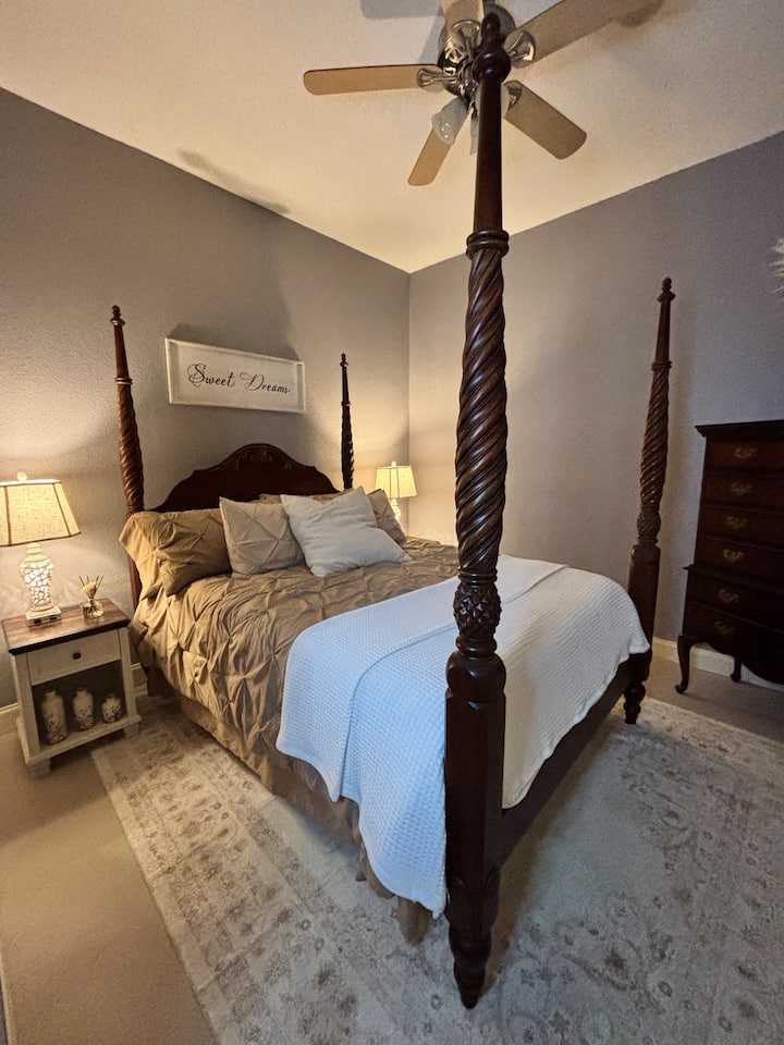 U spavaćoj sobi nalazi se prekrasan antikni bračni krevet s baldahinom i potpuno novim madracem od memorijske pjene prekrivenim plahtama od egipatskog pamuka i udobnim poplunom koji će vas uljuljkati u san, kao i komoda sa šest ladica za one koji vole raspakirati stvari. I 55-inčni televizor u ovoj sobi!