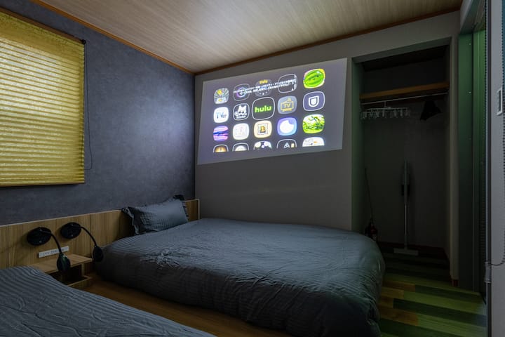 Ima tri sobe s tatamijima, kupaonicu s crnim pločnim pločicama i projektor za mirne večeri.