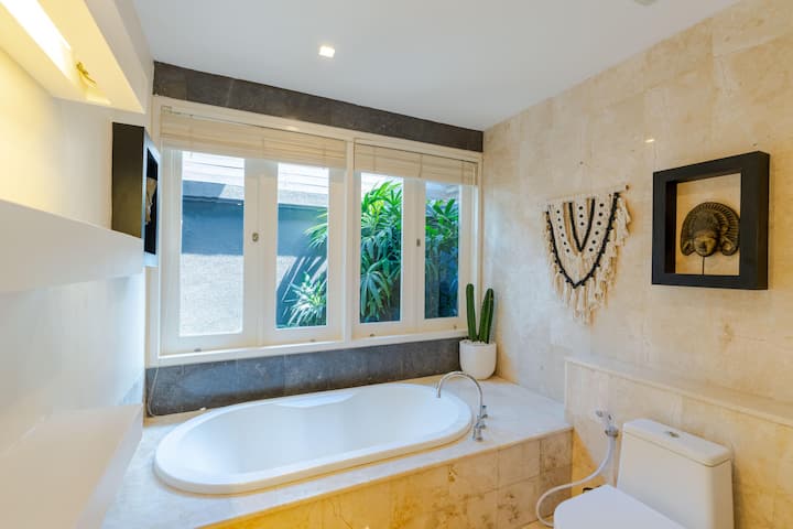 Ova vila s dvije spavaće sobe u kompleksu Boholuma nalazi se samo 2 minute od plaže Petitenget i ima privatni bazen, vrt i ležaljke za sunčanje. U dnevnom boravku koji je djelomično otvorenog tipa nalazi se pametni televizor, udoban kauč i potpuno opremljena kuhinja. Svaka spavaća soba ima bračni krevet, pametni televizor, klima-uređaj i privatnu kupaonicu s kadom, tušem i dvostrukim umivaonikom – savršeno za vaš bijeg na Bali.