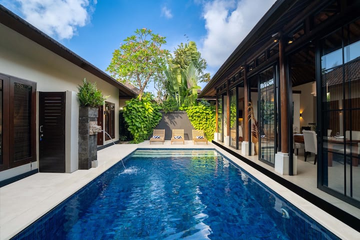 Vila ima privatni bazen okružen bujnim zelenilom i ležaljkama, idealan za sunčanje ili opuštanje nakon dana provedenog u prirodi. Iako se nalazi u najživljoj četvrti Balija, lokacija je mirna i skrivena, što osigurava mirne noći, a kafići, restorani, butici i klubovi na plaži su nadohvat ruke.