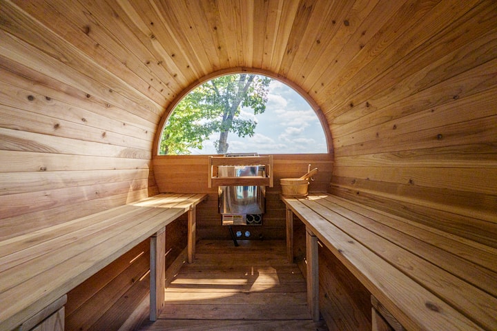 Ovaj je smještaj renoviran i preuređen kako bi se maksimalno iskoristili unutarnji i vanjski prostori za boravak, a to se vidi i po kućanskim aparatima i po vanjskom namještaju. U ponudi su kajaci, sauna, ledena kupka, ognjište, stolice adirondack, višeslojna terasa i pogled na jezero Round Lake! Najam pontona dostupan je na zahtjev.