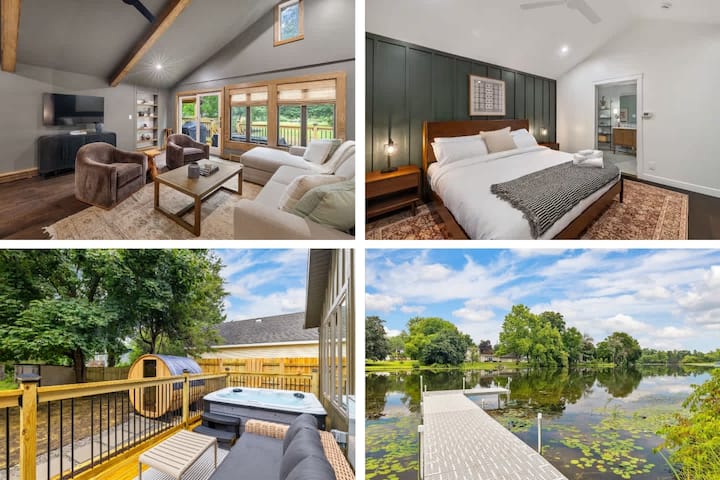 Naš prekrasan, umjetnički renoviran dom na obali sadrži pet spavaćih soba i tri kupaonice u Lindenu! Opustite se na terasi s ugrađenom masažnom kadom ili se okupite oko ognjišta pored jezera za ugodne večeri (ponesite vlastito drvo za potpalu i drva za loženje)! Ako tražite uzbuđenje, isprobajte naše hladno uranjanje i našu bačvastu saunu! Kuća se nalazi na rijeci Shiawassee koja je mirno, spokojno ušće koje se ulijeva u jezero Ponemah (iako nije dostupno brodom, pogledajte više o pristupu jezeru i najmu brodova u odjeljku „Jezero” u nastavku). Imamo pristanište s dvije daske za veslanje, dva kajaka i prsluci za spašavanje za cijelu obitelj. Naše ognjište i prostor za sjedenje u dvorištu, zajedno s velikim dvorištem, pružaju prekrasan ambijent za zabavu ili odmor na osami. Kuhajte za cijelu obitelj u našem prekrasnom dnevnom boravku i kuhinji (ili roštiljajte i uživajte u zalasku sunca na terasi), a nakon toga ispecite slatkiše na vatri! Ovo je savršeno mjesto za svako okupljanje ili odmor!