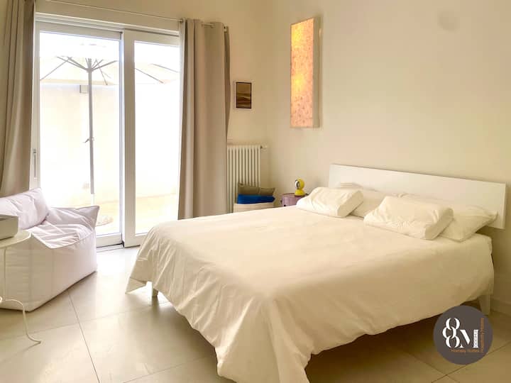 Sastoji se od predsoblja, velike sobe i terase na 9 m2 (opremljene umivaonikom, velikim suncobranom i 2 ležaljke) koja gleda na unutarnje dvorište; soba stoga ima velika francuska vrata koja zajedno s drugim prozorom pomažu da bude vrlo svijetla.