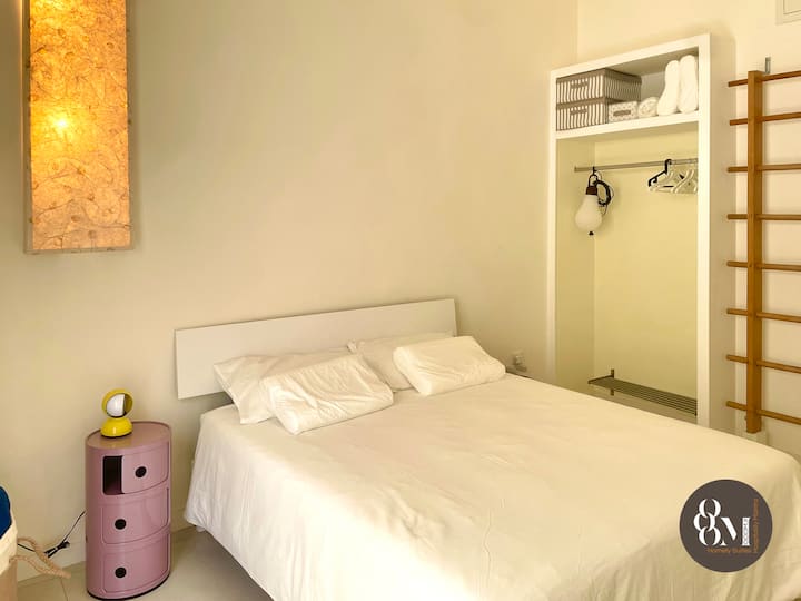 U spavaćoj sobi, osim bračnog kreveta (standardna širina 160 cm), nalazi se fotelja s tabureom, dnevni ormar i švedski drveni remen za teretanu, što je vrlo korisno kao stalak za odjeću; odlučili smo se za krevet s minimalističkom strukturom, isključivo od drva obrađenog bijelom melaminskom bojom i bez tradicionalnih premaza od tkanine kako bismo zajamčili veću higijenu. Osim toga, prostor u nastavku u potpunosti je besplatan, što omogućuje jednostavno i precizno čišćenje cijelog prostora.