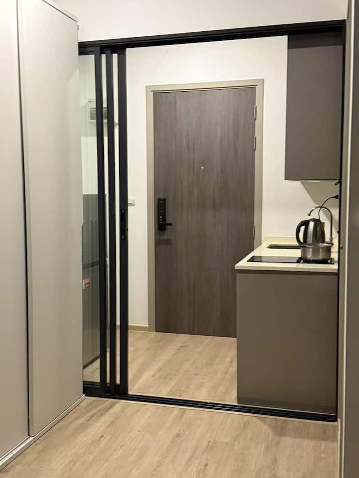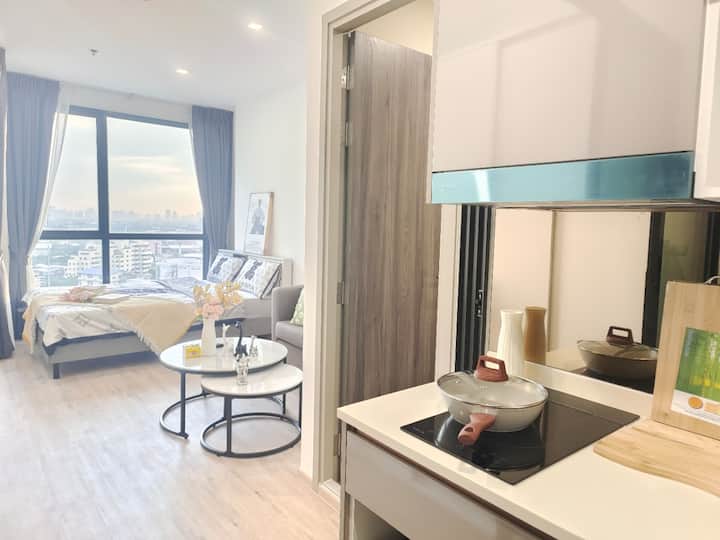 The apartment is located on the main Srinakarin road with Rama9, three tracks meet, 0m to MRT yellow line, 100m to the airport railroad, 4 stops to downtown, 10 minutes to Suvarnabhumi International Airport. 200m is the high-speed entry, very convenient transport.
