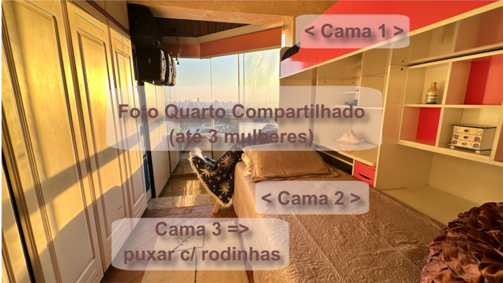 Shared Room Tour with up to 3 women, you can sleep and a maximum of 2 other women, within the High Standard Duplex Coverage with 4 suites, shared use of the apt, Condominium type Resort with Condominium, 24 reception and Security, complete gym, dry and wet sauna, pool, sports court, Squash, Games Hall with Sinuca, Pebolim and Carteado, Restaurant, Mini Market, etc.
