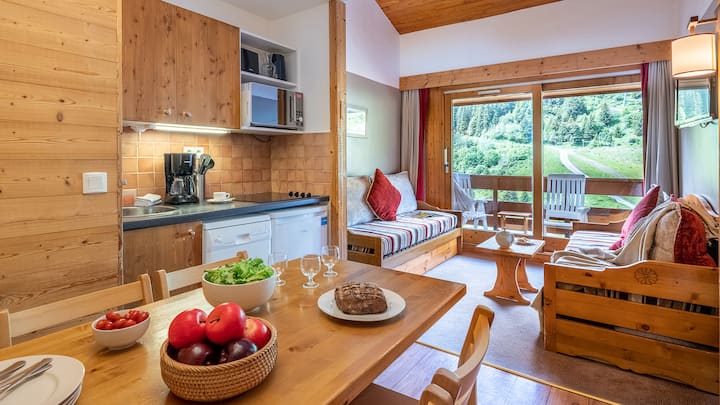 Okruženo šumom jele, ovo autentično selo zavodi turiste sa svojim drvenim planinskim kućama. Rezidencija se sastoji od 3 zgrade u tradicionalnom savojskom stilu i skladno se stapa s krajolikom koji je okružuje. Iza drvenih fasada balkona otkrit ćete udobne stanove u kojima dominira drvo, podsjećajući na duh planinske kuće. Veliki zaljevski prozor propušta svjetlo i pruža vam prekrasan pogled na bijele vrhove.