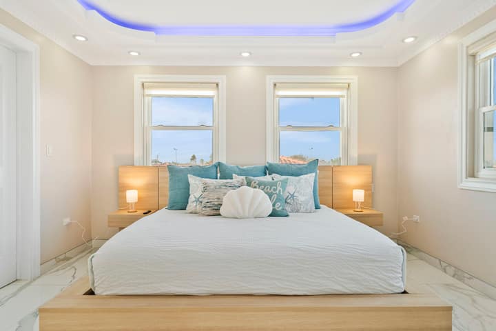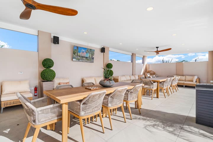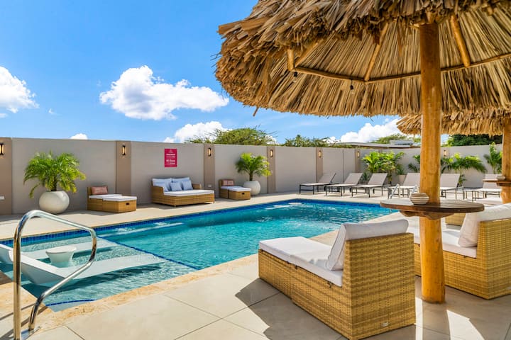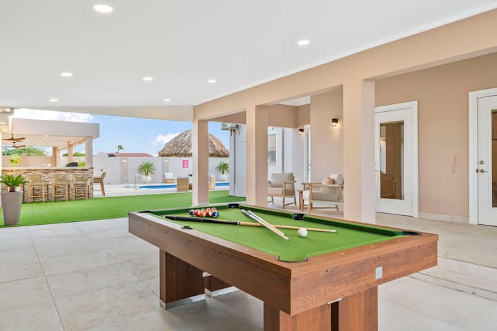 Iza vrata nalazi se prostor za zabavu: prostrani bazen u sjeni palapa, okružen ležaljkama i udobnim sjenovitim prostorom za sjedenje. Natkrivena vanjska kuhinja s ugrađenim roštiljem čeka vas za večeri ispunjene roštiljanjem i smijehom, dok dva stola za objedovanje na otvorenom pozivaju na duge, svečane objede pod vedrim nebom. Na rubu bazena nalazi se stol za biljar i stol za stolni tenis koji pozivaju na prijateljsko natjecanje i bezbrižnu zabavu pod vedrim nebom Arube.