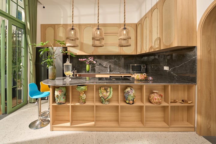 – Prostrani, svijetli dnevni boravak s velikim staklenim vratima koja se otvaraju prema tropskom vrtu, stvarajući osjećaj blizine prirode i prirodnog svjetla.