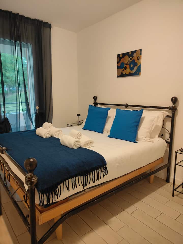 🩵 Plava soba – dvokrevetna, elegantna i opuštajuća, s noćnim ormarićima i velikim ormarom.