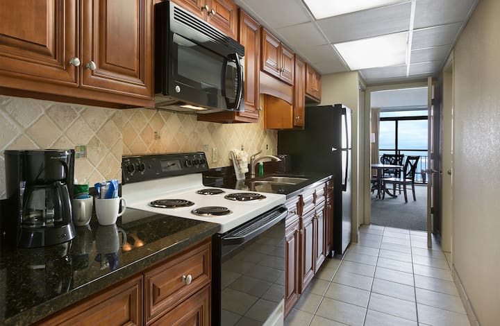 Doživite pravi život na obali u ovom kondominiju s jednom spavaćom sobom u Landmark Resорту, gdje je ocean vaš stalni suputnik. Savršena za obitelji ili male grupe do četiri osobe, spavaća soba ima veliki bračni krevet, dok susjedni dnevni boravak nudi udoban kauč i dvosjed na razvlačenje. Obje su sobe opremljene televizorima ravnog zaslona kako biste mogli uživati u omiljenim emisijama bilo da se opuštate nakon dana sunčanja ili se okupljate za filmsku večer.