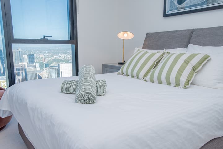 🏙 Pogled: Neprekidna svjetla grada sa 73. kata.🚉 Lokacija: 1 minuta do Southern Crossa i zone besplatnog tramvaja.🛏 Za 2 osobe: Udoban bračni krevet.