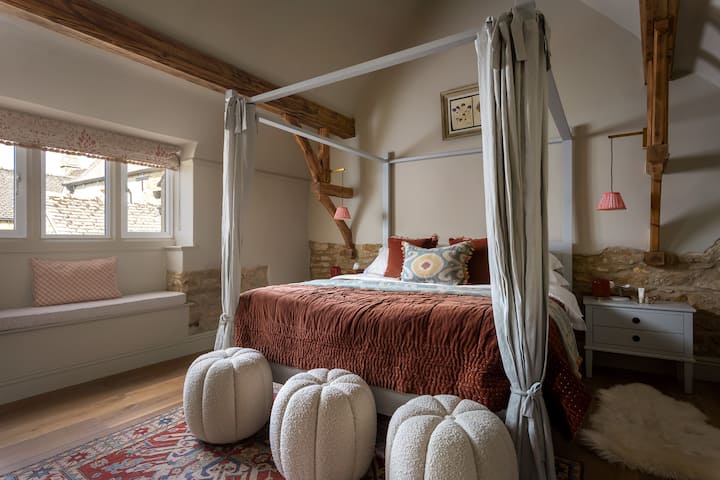• Glavna spavaća soba: impresivan super veliki bračni krevet s baldahinom i luksuznom posteljinom, rustikalne grede na stropu i umirujuće neutralne boje.