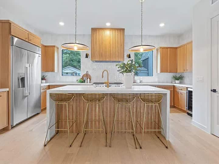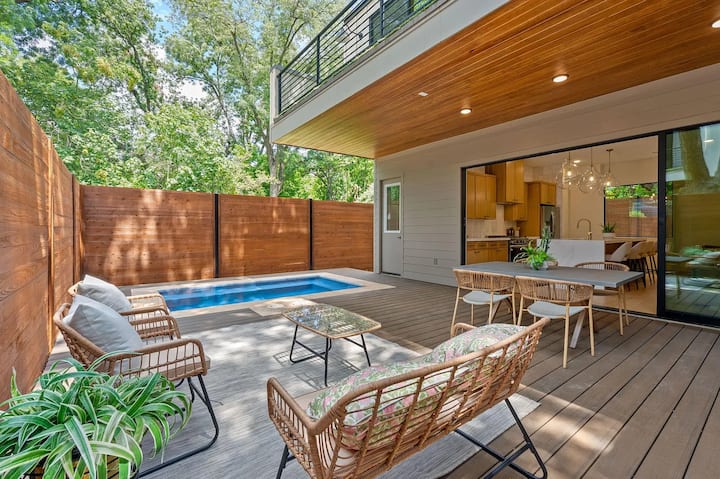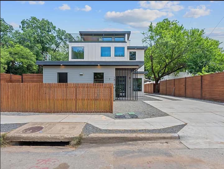 Smještena na jednoj ekskluzivnoj parceli, ova vila pravo je utočište sa stilskim interijerima, salonima na krovu i još mnogo toga. Samo 2 ulice od Rainey Street i centra grada, ovo utočište nudi udobnost, privatnost i nezaboravne trenutke na najtraženijoj lokaciji u Austinu.