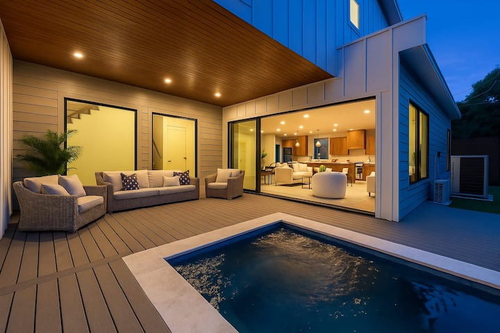 U stražnjem je dvorištu, koje je uređeno tako da gosti mogu maksimalno iskoristiti sunčane dane u Austinu, privatni bazen s ugrađenom masažnom kadom, natkrivena terasa i više prostora za opuštanje. Ograđeno dvorište pruža privatnost i udobnost, bilo da uživate u kupanju u bazenu ili organizirate večernji roštilj.