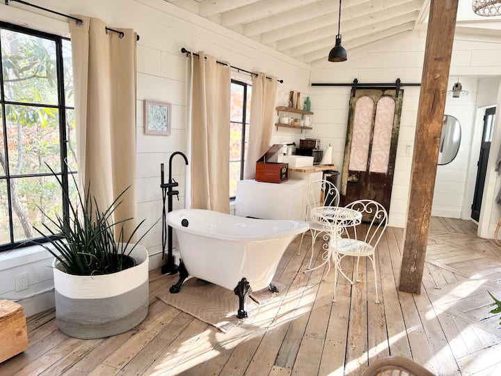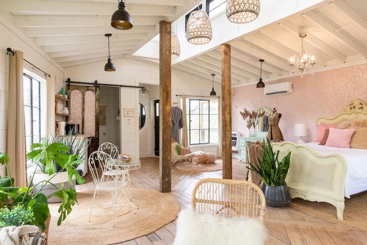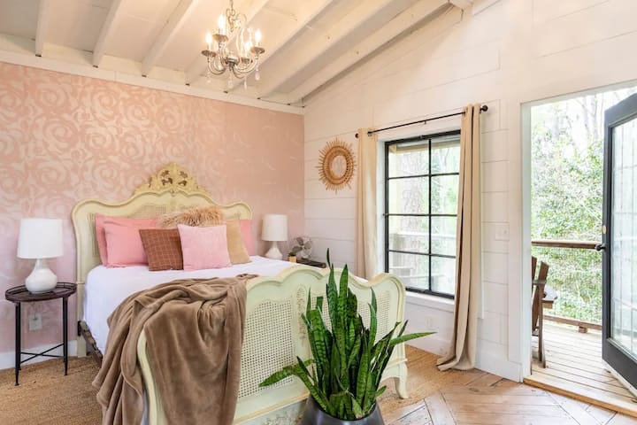 Probudite se uz pogled na miran vrt iz svakog prozora ovog smještaja iz snova koji se nalazi na povišenom mjestu. Smještena na visini od 25 stopa u 400 godina starom hrastu, ova romantična ružičasta kuća na drvetu (Jedinica 6) spaja rustikalni šarm s luksuznim detaljima, poput udobnog luksuznog bračnog kreveta, 250 godina starih greda i elegantnog HDTV-a s Netflixom za ugodne noći.