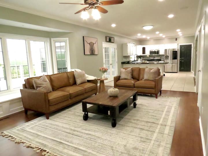 Ovaj lijepo uređeni smještaj nalazi se na posjedu od 10 hektara s predivnim pogledom. Objekt ima oko 2 jutra dvorišta koje je visoko 6 stopa i potpuno ograđeno. Uživajte u pogledu s velike, osvijetljene terase na kojoj se nalazi više razina. Unutra ćete pronaći topao i otvoren tlocrt. Kupaonica na glavnom katu s tušem, velika potpuno opremljena kuhinja, uključujući smočnicu, velika blagovaonica, dnevni boravak s francuskim vratima koja vode do velikog dnevnog boravka s plinskim kaminom. Na katu se nalaze 4 prostrane spavaće sobe, a tu su i prekrasna glavna spavaća soba, dva walk-in ormara i glavna kupaonica. Glavna kupaonica ima veliku kadu s hidromasažom, podno grijanje, tuš s grijanjem, 6 mlaznica za tijelo i veliki gornji tuš s efektom kiše. Na katu se nalazi mala kupaonica s vlastitom tuš-kabinom s pločicama koje su posebno dizajnirane za tu kupaonicu. Praktična praonica rublja na drugom katu s dovoljno prostora za slaganje i glačanje. Uživajte u masažnoj kadi za 6 osoba s prelijepim, skrivenim pogledom. Podovi od tvrdog drva u prizemlju i laminatni podovi na katu. Ovaj je smještaj savršen za obitelji i putnike koji traže udoban, prostran i luksuzan smještaj.