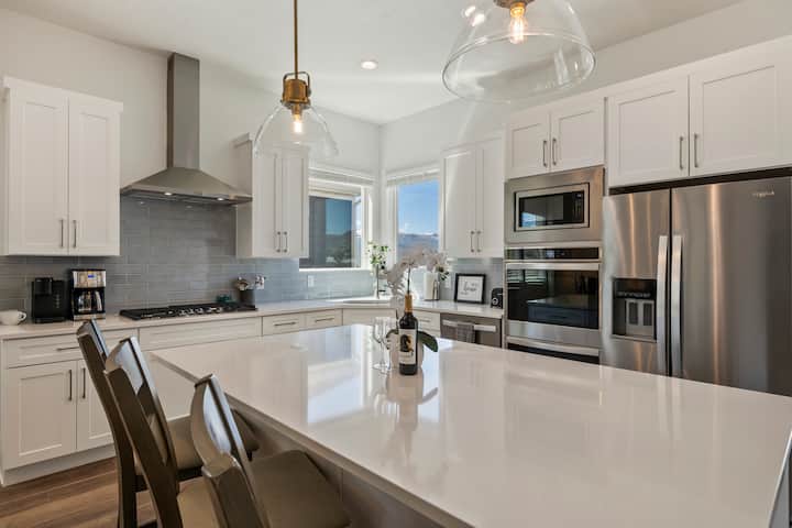 Pobjegnite u Sunset Vistu, gdje se planinski spokoj isprepliće s modernim luksuzom. Ovaj prostrani smještaj s 4 spavaće sobe nalazi se u mirnom Heber Valleyju, na samo 25 minuta od staza i atrakcija u Park Cityju. Uživajte u gurmanskoj kuhinji, udobnom kaminu, pametnim televizorima u svim prostorijama, predivnom pogledu na planine i vanjskom prostoru za roštilj. Savršeno za obitelji koje traže avanturu i opuštanje.