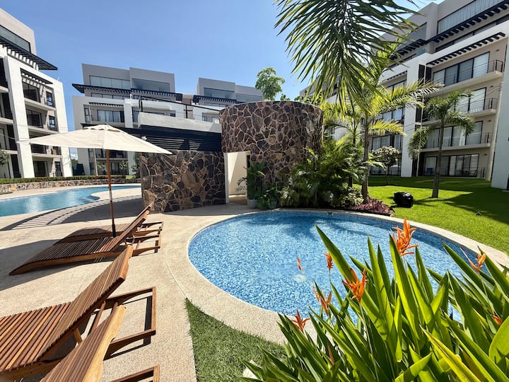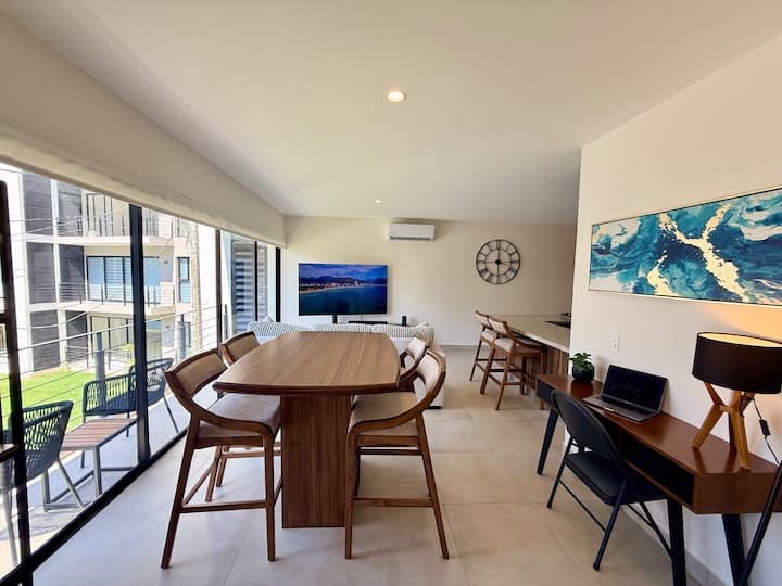 Moderni kondominij s 2 spavaće sobe i fleksibilnim rasporedom s pogledom na bazen u stilu odmarališta, vrtove i prostor za roštilj. Okrenut prema jugozapadu za toplo popodnevno svjetlo i prekrasan pogled na zalazak sunca. Interijer koji je profesionalno dizajnirao The Signature Estates s privatnim balkonom, brzim Wi-Fi-jem, 75-inčnim pametnim TV-om, kućnim kinom, kompletnom kuhinjom i perilicom/sušilicom rublja u smještajnoj jedinici. Nalazi se na 2. katu s pristupom dizalu i dodijeljenim parkingom u mirnoj ograđenoj zajednici u blizini Marine Vallarta, plaža, zračne luke, Galeríasa i hotelske zone. Za najviše 6 osoba.