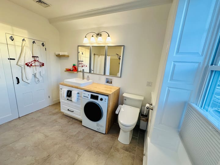 (1C) Kupaonica nudi sveobuhvatnu perilicu i sušilicu za male količine odjeće. Ugrađen je bide Toto koji nudi grijanu garnituru za sjedenje i toplo pranje. Dostupna je standardna kada i glava tuša s ručnom prskalicom. U kupaonici su na raspolaganju ručnici, podne prostirke, sušilo za kosu, šampon, regenerator, gel za tuširanje i sredstvo za čišćenje cipela.