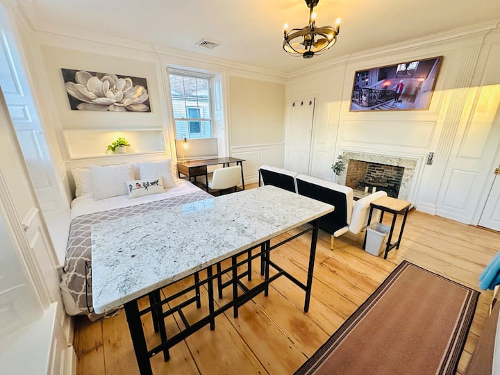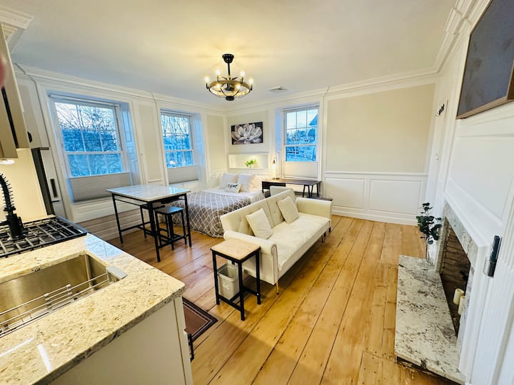 1. POVIJESNA KUĆA. Iznajmljujete povijesnu kuću koja je starija od Sjedinjenih Američkih Država! Nastojimo obnoviti kuću s što većom mogućom udobnošću. Međutim, njegovi vrijedni originalni široki borovi podovi imaju nagnute površine. Vrata s dvije strane kamina nagnuta su jer su bila izvorni dizajn zakrivljenih brodskih pretinca.