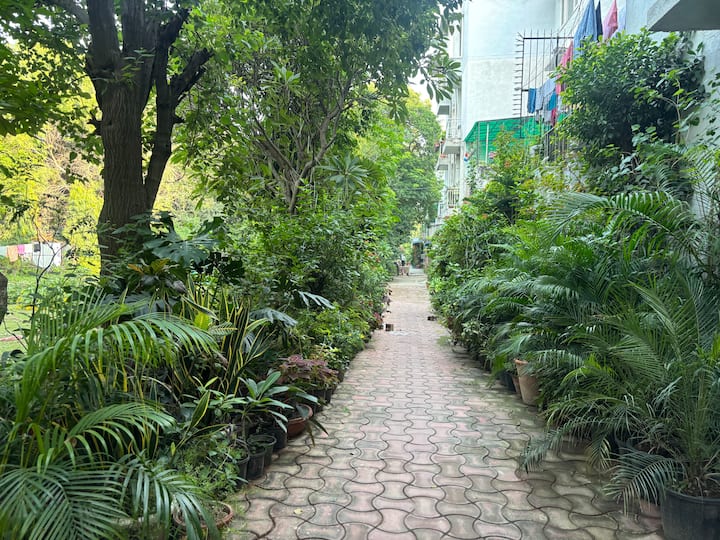 🌿 Garden: Vaše privatno utočište za opuštanje u miru i tišini, okruženo bujnim zasjenjenim drvećem (Neem, Mango i Bougainvillea) i brojnim lončanicama/biljem koje se uredno uzgaja i održava.