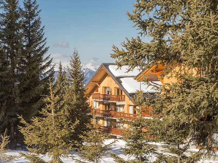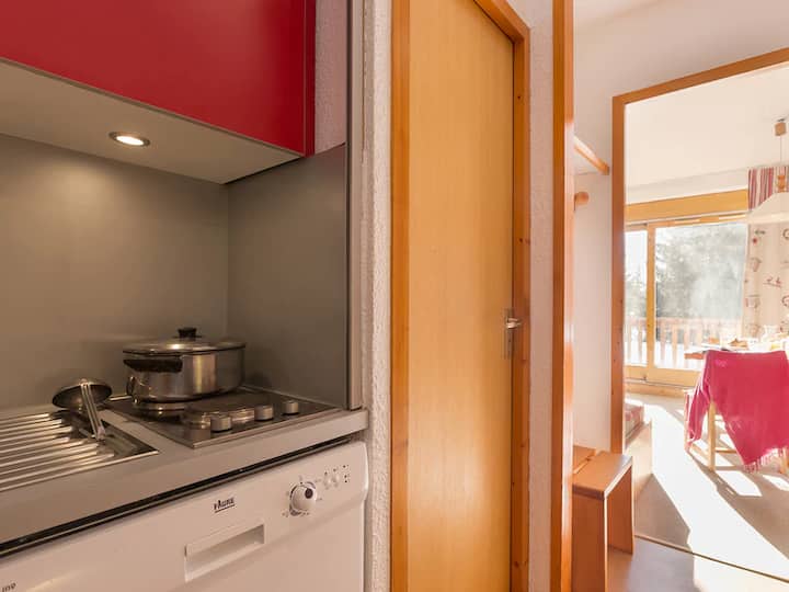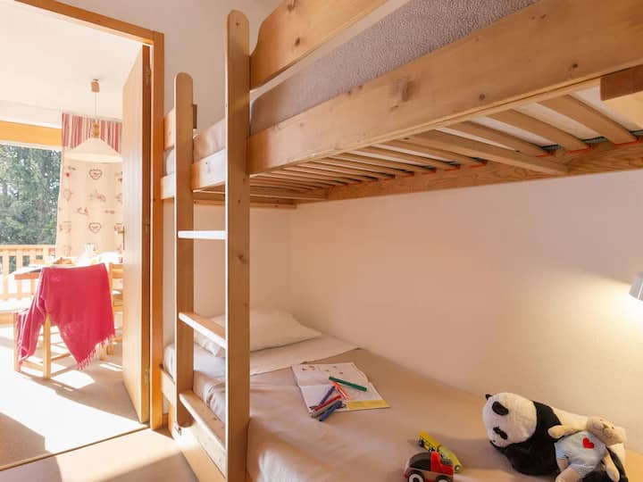 Serviced apartment in Méribel Altiport! on the banks of the Blanchot and Forest slopes, it is 21m² for 4/5 people facing west. Ima opremljenu kuhinju, dnevni boravak s kaučem na razvlačenje i brvnaru s krevetima na kat, balkonom i posteljinom. Uživajte u prostoru za opuštanje i zabavi za djecu. Dostupan je besplatan parking iznad glave. Free Méribus shuttle to reach the different neighborhoods of the resort and nearby shops.