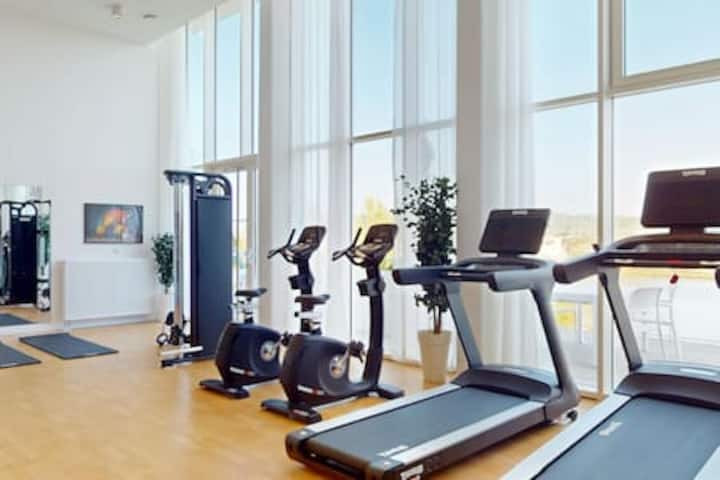 Za vježbanje su vam na raspolaganju pokretna traka, sobni bicikl, prostirka za jogu i utezi.
