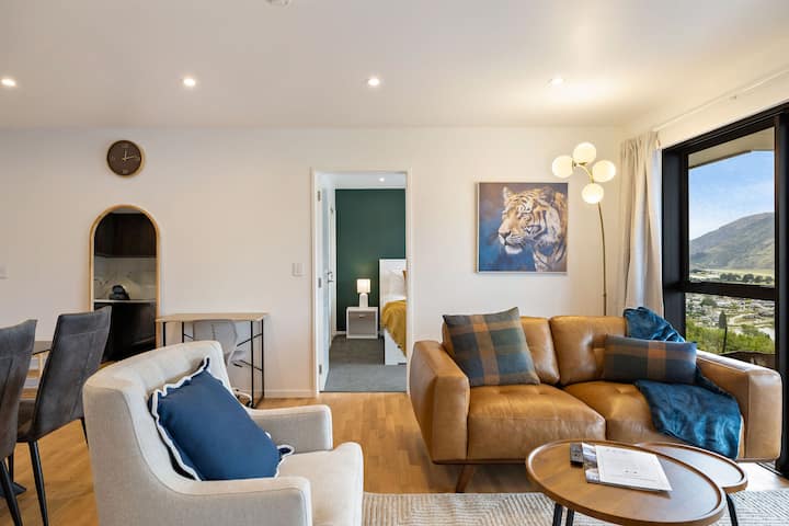 Zapanjujuća nova dvokatna kuća smještena iznad Queenstowna s pogledom na jezero, privatnim masažnim bazenom i dovoljno prostora za obitelj ili grupu koja putuje zajedno. Ovaj je objekt uređen kao kombinirani dvostruki stan, a na katu se nalazi još jedna stambena jedinica s vlastitim ulazom.