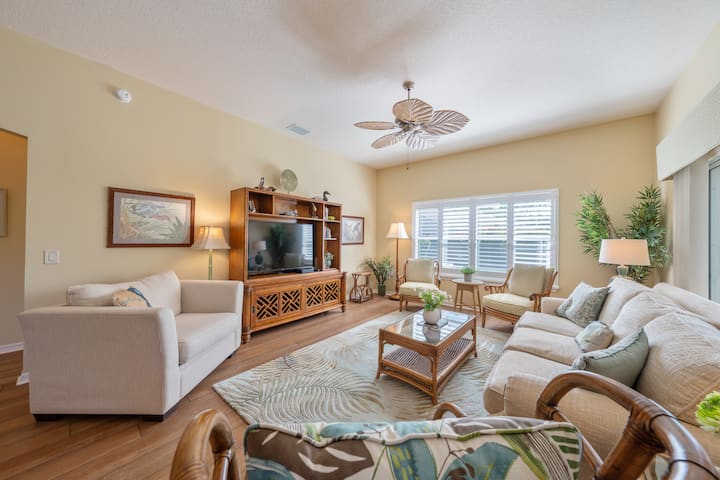 Pobjegnite u raj u Tamarind Groveu! Ovaj kutni smještaj s 3 spavaće sobe i 2 kupaonice ima oazu u dvorištu ograđenu kamenim zidom i bujnim tropskim zelenilom. Opustite se u masažnoj kadi pod zvijezdama, uživajte u prostranom natkrivenom lanaiu ili se vozite u električnom vozilu za golf koje je uključeno u cijenu. Vrlo tražena lokacija, bit ćete blizu omiljenih mjesta za zabavu, shoppinga, restorana i BESPLATNE NOĆNE ZABAVE. Ovo utočište spaja luksuz, praktičnost i čisto opuštanje u jednom nezaboravnom boravku.