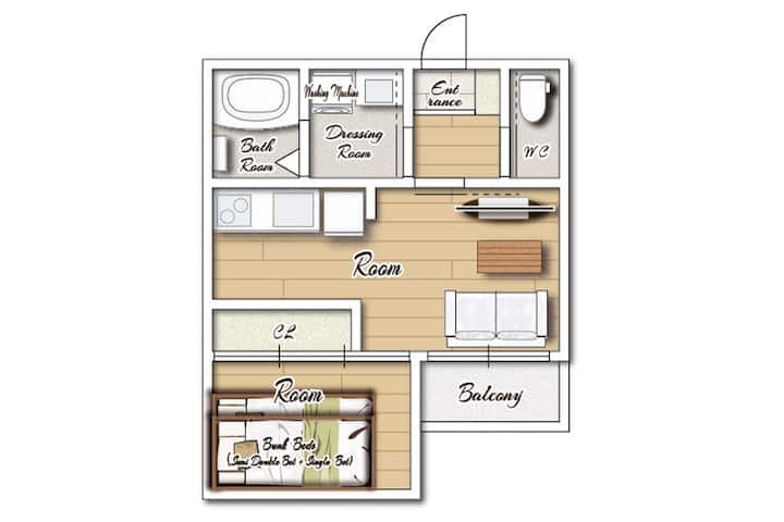 [Rogzman Hakata] (jednokrevetna + poludvokrevetna) 1 krevet na kat, zabranjeno pušenje