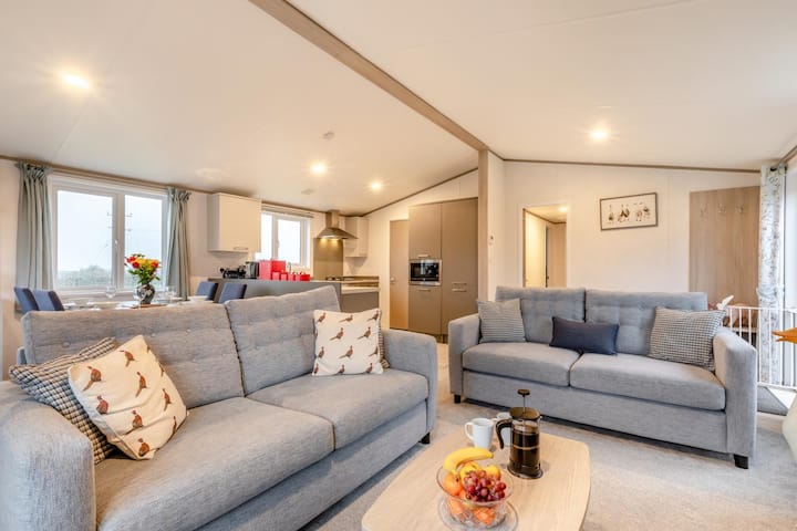 Popnite se uz tri vanjske stepenice kako biste ušli u ovo ugodno utočište, gdje možete uživati u jednostavnosti života u prizemnoj kući. Otkrijte svijetli i prostrani dnevni boravak/kuhinju/blagovaonicu otvorenog tipa, gdje se prirodno svjetlo izlijeva kroz dva kompleta francuskih vrata. Iz njih se izlazi na privatnu ograđenu terasu s pogledom na ogradu za konje – savršeno mjesto za jutarnju kavu ili piće u sumrak. Uronite u plišane sofe i opustite se ispred Smart TV-a ili se okupite oko stola za blagovanje kako biste uživali u obrocima s pogledom. Kuhinja je dobro opremljena za sve, od lijeno provedenih doručaka do bogatih večernjih gozbi, a tu je i korisna pomoćna prostorija s perilicom rublja, idealna za duže boravke. Objekt nudi dvije prekrasno uređene spavaće sobe u nježnim, umirujućim tonovima: dvokrevetnu sobu s vlastitom kupaonicom s tušem i udobnu dvokrevetnu sobu. Obiteljska kupaonica s tušem iznad kade upotpunjuje unutarnji raspored.