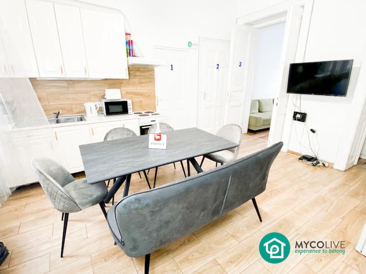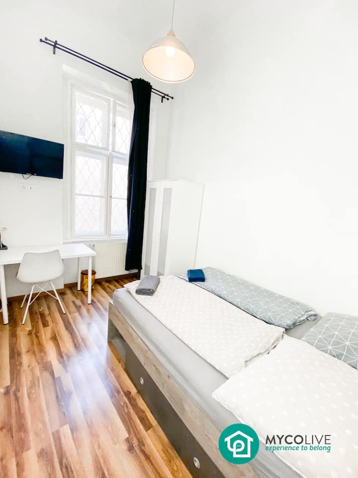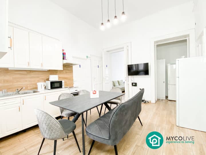 Više opcija u aplikaciji MYCOlive, pogledajte video obilaske tamo i na YouTubeu. Nudimo ekološki prihvatljive, potpuno namještene sobe i stanove s fleksibilnim ugovorima. Naši su klijenti mladi profesionalci, studenti, digitalni nomadi i agencije za upravljanje smještajnim kapacitetima. Također dočekujemo mnoge obitelji i prijatelje za grupni odmor u našim velikim stanovima.