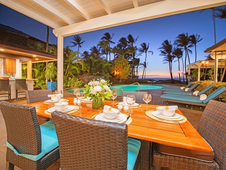 Uživajte u vlastitom posjedu od pola hektara s ograđenim dvorištem i bazenom gdje možete promatrati nevjerojatne tropske zalaske sunca, osjetiti blagi morski povjetarac i uživati u prekrasnom pogledu na ocean na otoke Kaho 'olawe, Lanai i planine Zapadnog Mauija