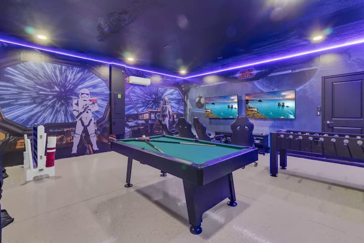 • Svemirski brod s klimatizacijom uređen na temu Ratova zvijezda ima bilijarski stol, stolni nogomet s elektroničkim osvjetljenjem, konzole Xbox i PlayStation povezane s televizorima i stolice za igranje videoigara