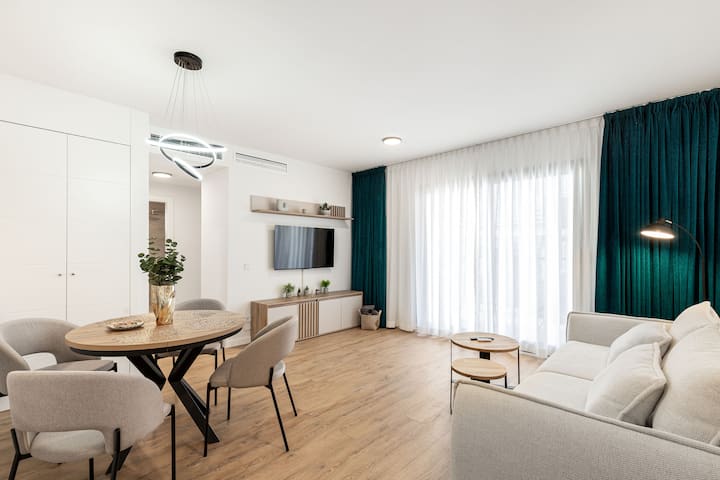 Elegantan dvosobni stan u popularnom stambenom kompleksu Estepona. Svijetao, moderan i potpuno opremljen, ima prostrani dnevni boravak otvorenog tipa, udobne spavaće sobe i privatnu terasu za opuštanje. Gosti mogu uživati u prekrasnom krovnom bazenu s predivnim pogledom. Smješten u mirnoj, dobro održavanoj četvrti u blizini plaže, marine, trgovina i stare gradske jezgre Estepona – idealno za parove, obitelji ili duže boravke.